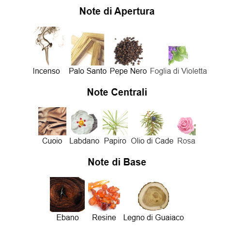 Profondità e Carattere: Dominanza di Incenso, Legno d'Ebano e Cuoio per una fragranza non convenzionale.