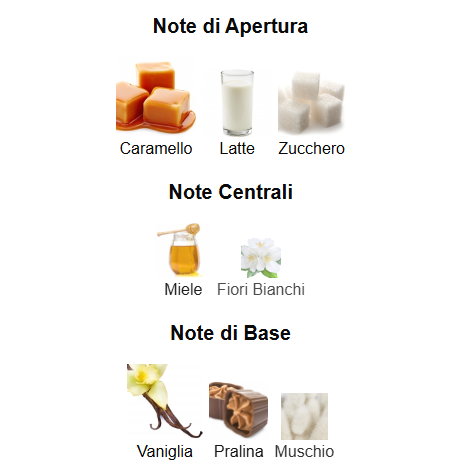 L'apertura è immediatamente irresistibile e quasi commestibile: una fusione di Caramello ricco e Latte cremoso, addolciti da un tocco di zucchero e bilanciati da una punta luminosa di Bergamotto. Il cuore è un bouquet zuccherino, con note di Miele caldo e Fiori Bianchi come la Tuberosa, che conferiscono alla dolcezza un corpo floreale e avvolgente.