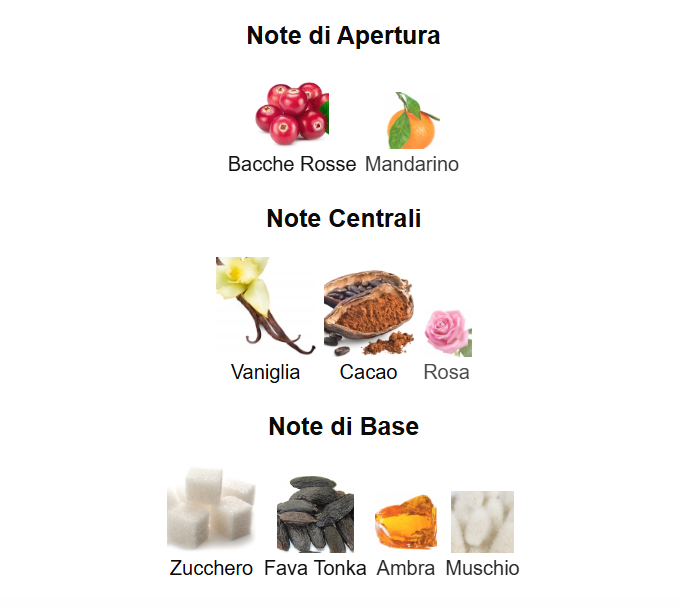 Note di Fondo: Zucchero, Fava Tonka, Ambra e Muschio (Una base calda, dolce e avvolgente che assicura una lunga persistenza).