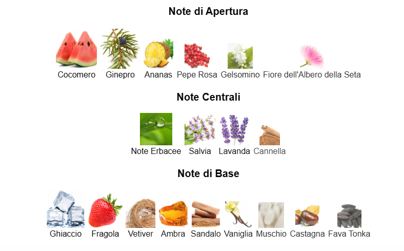 L'apertura è un'esplosione succosa e allegra: un cocktail vitaminico di Anguria, Ananas e Mela Rossa che dona una sferzata di energia immediata. Questo slancio fruttato si attenua nel cuore, dove emerge un accordo aromatico e sensuale dato dalla freschezza della Lavanda e della Salvia, mescolati a un tocco sottile e avvolgente di Cannella.