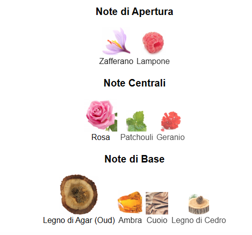 L'apertura è un invito diretto nel cuore dell'Oriente: una miscela calda e speziata di Zafferano e Cardamomo, che crea un'immediata sensazione di opulenza. Questo inizio si fonde rapidamente in un cuore intenso, dove il Cuoio assume il ruolo principale, accompagnato da una nota di Rosa che ne ammorbidisce l'impatto e da un tocco terroso di Patchouli.