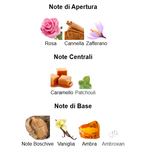 L'apertura è calda e regale, un trionfo di Cannella speziata e Zafferano prezioso, arricchito da un tocco di Rosa che ne ammorbidisce l'impatto. Il cuore è il vero punto focale della fragranza: un accordo unico e avvolgente di Caramello fuso, che si fonde con l'oscura profondità del Patchouli e del Legno di Agar (Oud).